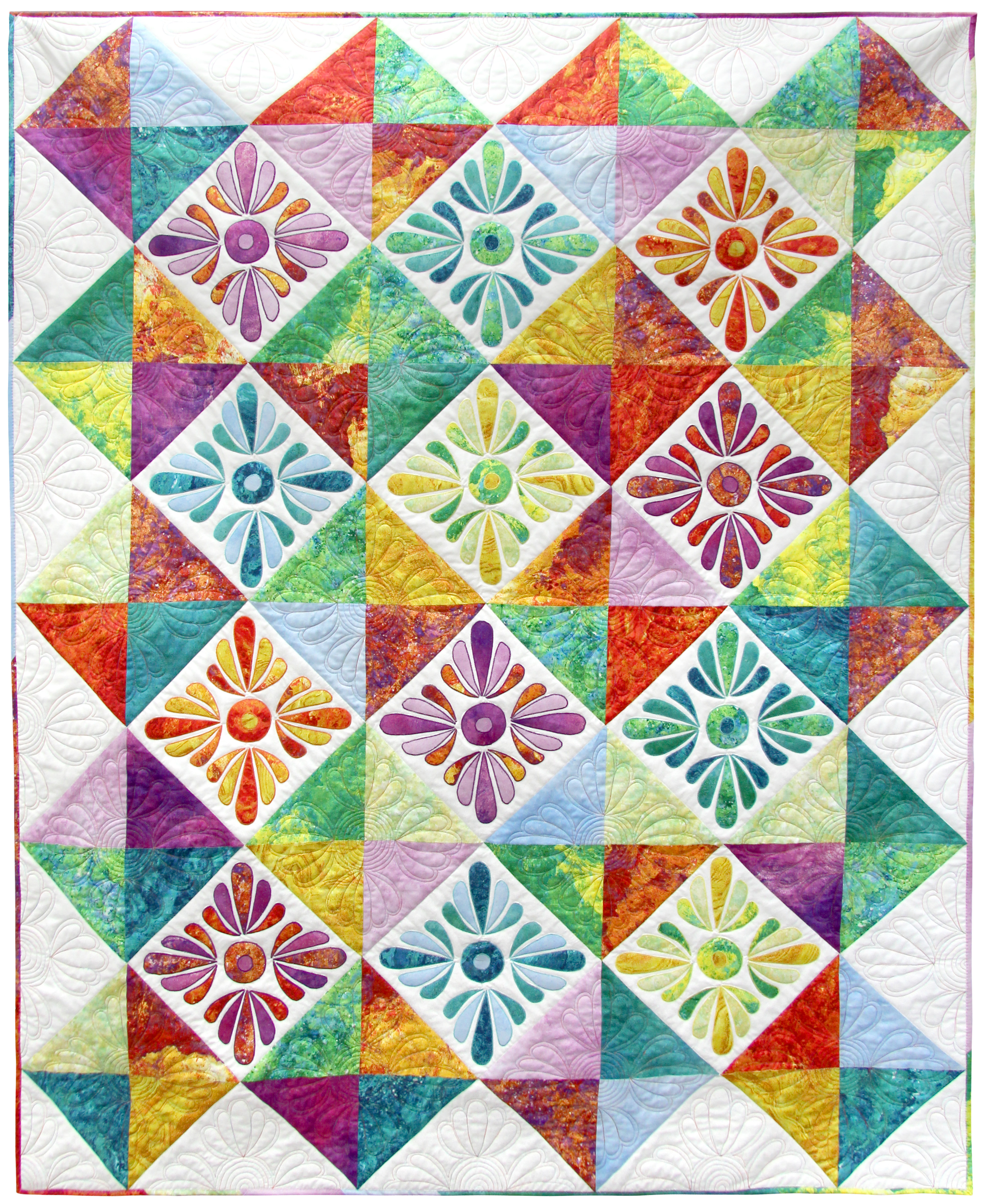 I downloaded the fabrics into my EQ7 program and began playing. Once I had finalized my design, I emailed it to the folks at Quilter’s Newsletter. Much to my surprise, they accepted it, and sent me details of the deadline for the finished quilt. I quickly wrote the instructions so that my oh-so-talented piecer Susanne could whip it up. Then I quilted it, Susanne bound it, and we sent it off to the magazine. We called it Hawaiian Punch. I think it is such a cheerful quilt, with its bright colors contrasting against the white background. Quilters Newsletter will be having a blog tour early October to launch the issue, and I hope to participate. There will be prizes, so check back around then to participate. The last time I participated in a blog tour was for the launch of Quiltmaker’s 100 Blocks issue – I showed my block in different Northcott collections. Both I and the visitors to my blog were amazed at how different the block and resulting quilts looked depending on the fabrics used. I’m not sure if Hawaiian Punch would look good in any other fabrics – we shall see!