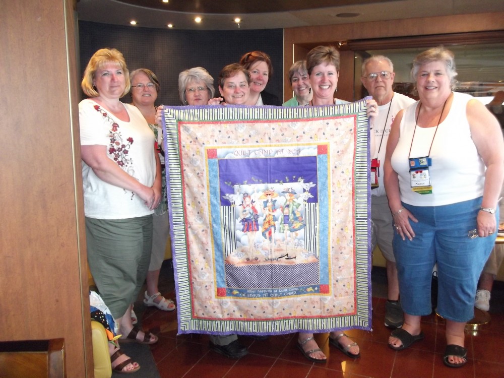 I had eight students in my mystery class, and they did an amazing job of getting their class projects almost completely done.  In the process, they learned several different border techniques, including working with stripes in borders and getting them to match in the corners.  Several students, including JoAnne, managed to get all but the final border on their quilts.  Woo-hoo!  Quilt Camp at Sea coordinator Pat Tobin and her staff did an outstanding job keeping everything running smoothly.  Pat is passing the torch on to fellow staffer Kathy Domkoski, who is organizing the 2013 Alaska cruise June 22-29 and also a Fall 2013 New England/Canada cruise.  Visit www.quiltcampatsea.com for details.