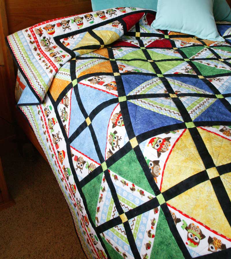 That’s why, when I make a holiday or seasonal quilt, I like to make something that is really quick and easy – I want to get the quilt done and on the bed long before the holiday is over.BCQ14_Cover_800  Take my Hootin’ Holidays quilt that is in the 2014 issue of Quilter’s Newsletter’s Best Christmas Quilts, on newsstands now.  I used Northcott’s Holiday Hoot flannel collection, with its adorable owl border stripe.