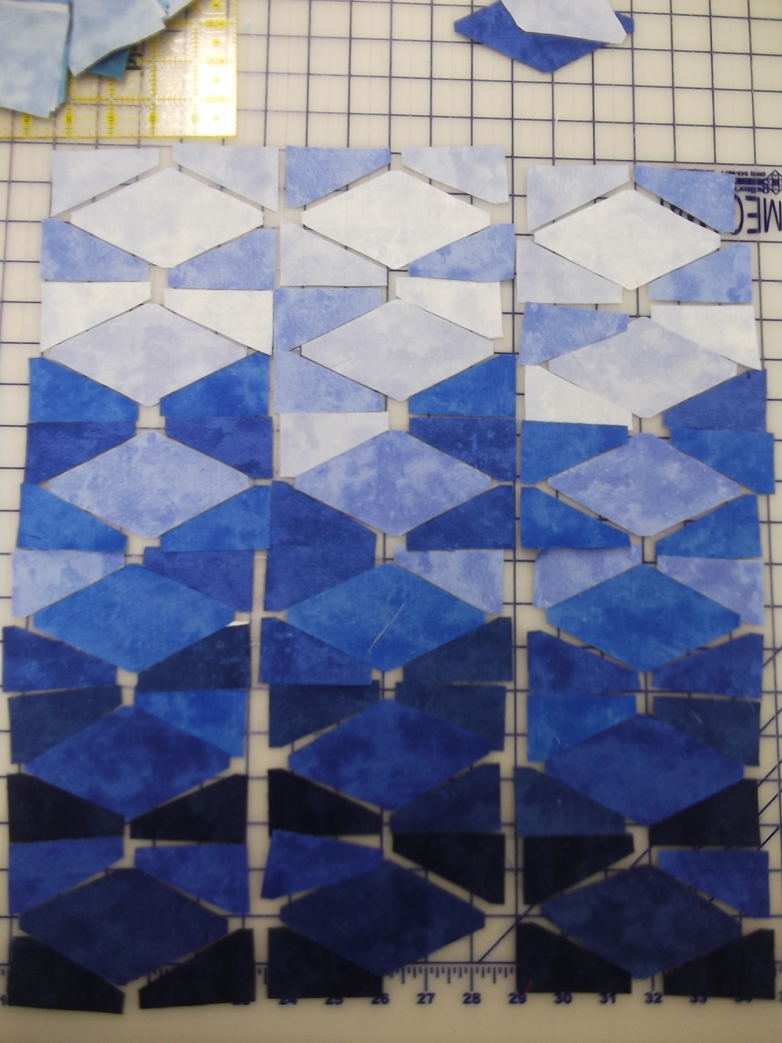 I selected warmer teal blues for the flying geese blocks to fill the sky. I randomly arranged them on my work surface, moving them around until I liked the color placement.