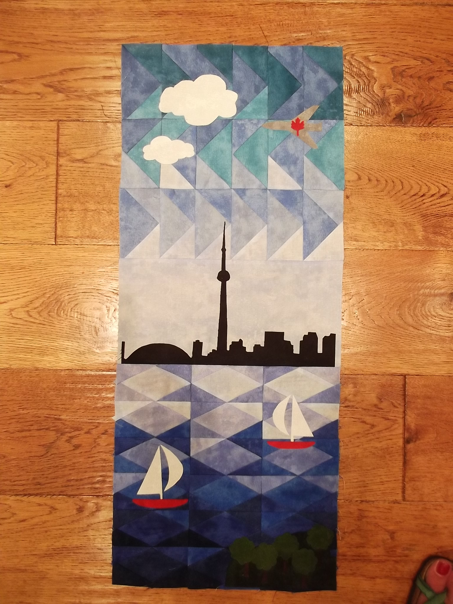 I am a Toronto girl, born and raised here. While I now live an hour’s drive north of the city, I still travel into the city to enjoy all that it has to offer – world-class theatre, cuisine from every corner of the earth, top designer boutiques, professional sports teams (including World Series winner Toronto Blue Jays), world-renowned hospitals & universities, all crammed into the city. Despite that, it is a very green city. Toronto is on Lake Ontario, one of the Great Lakes, and our waterfront is a leisure playground, with lots of boating in the summer months. The best view of our spectacular skyline is from the Toronto islands, just offshore of the waterfront. Toronto is the biggest city in Canada, and our airport is the hub for air traffic to the US and overseas. How do I design a row reflecting these characteristics of my hometown?