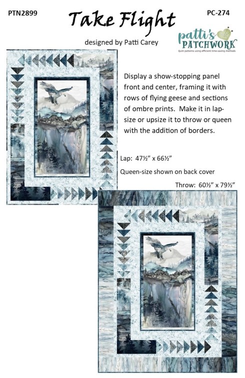 And my most popular release ever is Take Flight, using Northcott’s drop-dead-gorgeous Soar collection.  This pattern includes 3 size options (find it here), of which the throw size is available shortly from Keepsake Quilting or your local quilt shop.