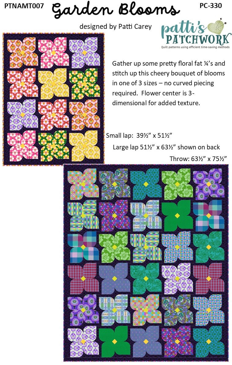 Anna Maria Textiles’ first batch of collections is starting to ship to stores, along with 3 of my patterns featuring these delicious fabrics. PC330 Garden Blooms is a fat ¼ friendly pattern with fun 3-dimensional centers in the flower blocks.