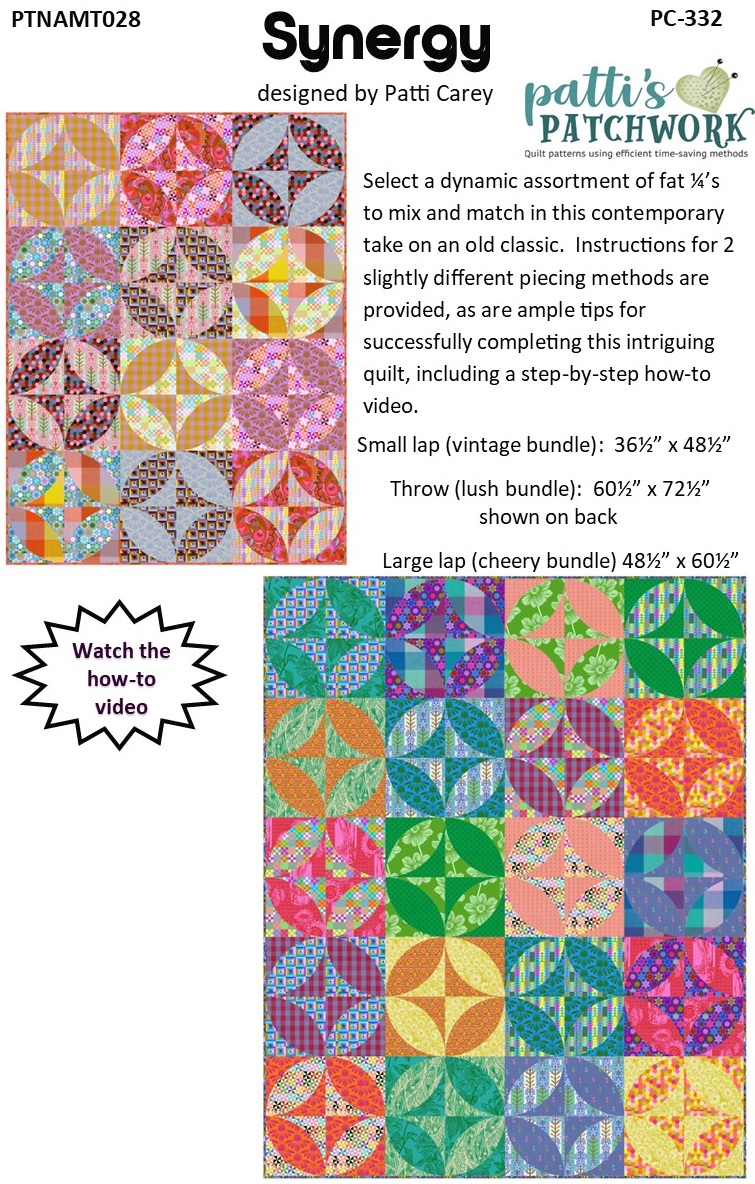 Stretching my modern creative muscle, I created PC332 Synergy, a fat ¼ pattern that utilizes the colorway fat ¼ packs of Anna Maria’s first release under her new AMT brand.
