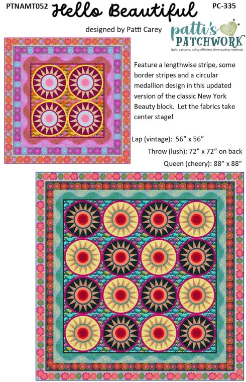 PC335 Hello Beautiful showcases a small medallion fabric and some border stripes in a modern take on New York Beauty. This quilt is a personal favorite of mine and it’s on my sewing table awaiting completion.