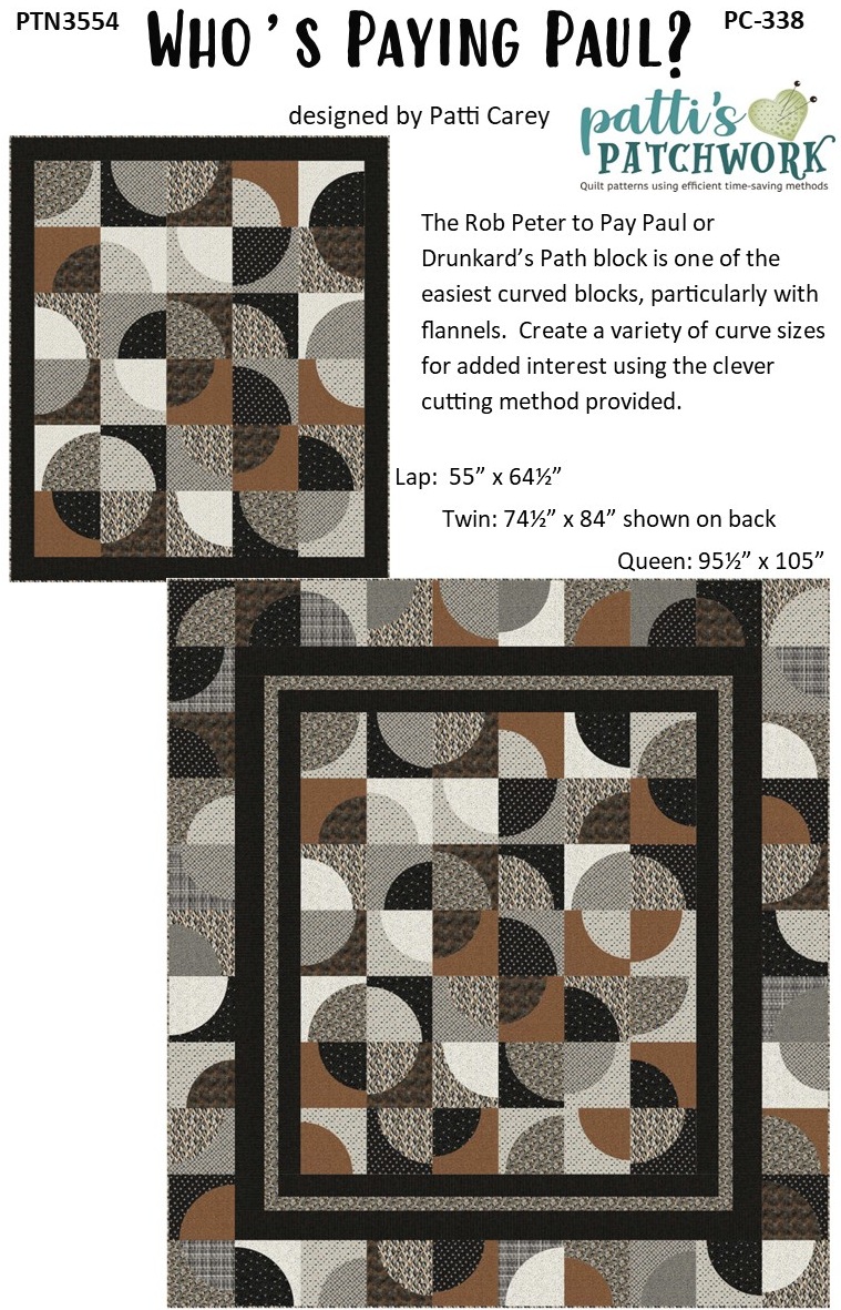 Don’t let the curves in PC338 Who’s Paying Paul frighten you – they’re actually quite manageable, especially with Northcott’s Haberdashery flannel collection. Curves and flannel go together like peanut butter and jelly. A clever cutting method means minimal waste with these curved blocks. You’ll be a curve-master in no time!