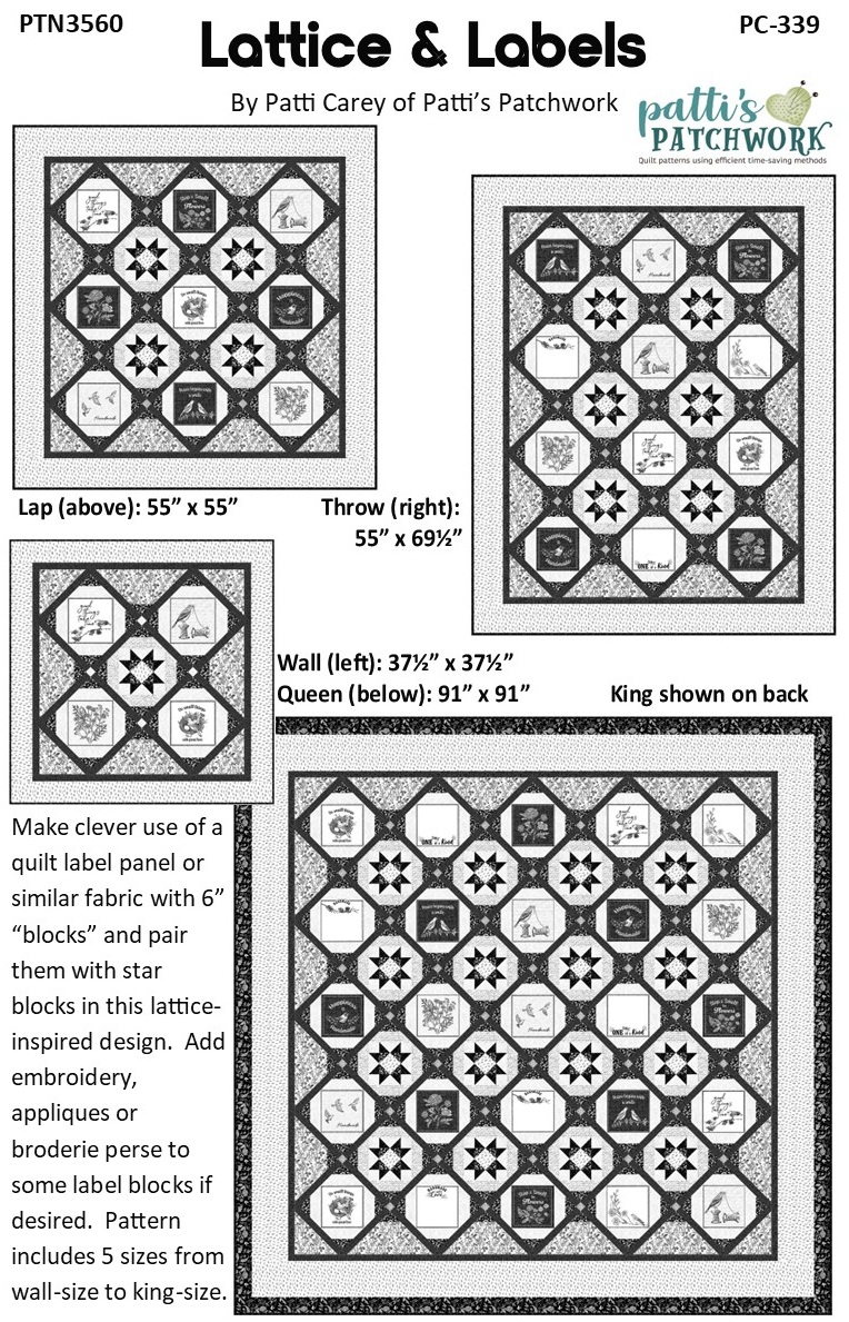 PC339 Lattice & Labels makes excellent use of the 6” squares from Northcott’s Nature’s Sketchbook label panel for a classic quilt in 5 sizes.